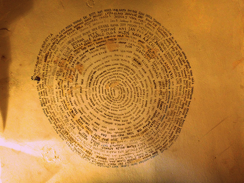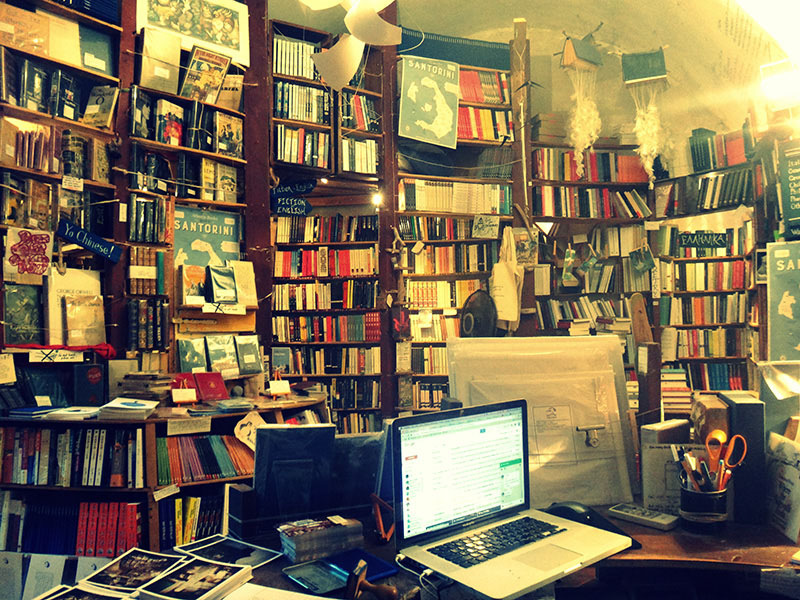 Είναι πολύ ωραίο μέρος και δεν υπήρχαν βιβιοπωλεία εδώ. Το είδαμε σαν αστείο, όταν το ξεκινήσαμε. Ήμασταν 21 χρονών, όταν επισκεφθήκαμε το νησί για πρώτη φορά. Ήταν Απρίλιος και όλα ήταν τόσο ήσυχα και πράσινα. Φαντάσου! Απρίλιος του 2002. Ήταν ήσυχα και όμορφα. Υπήρχε χώρος και χρόνος. Μέναμε στο Ημεροβήγλι. Και το 2002 γινόταν κοσμοσυρροή, αλλά όχι όπως σήμερα. Είχαμε ακούσει λοιπόν ότι ήταν όμορφα και είπαμε να έρθουμε να εξερευνήσουμε. Διαβάζαμε τα βιβλία μας (εδώ διάβασα την «Λολίτα») μέχρι που τα τελειώσαμε και θέλαμε να διαβάσουμε και άλλα όμως δεν υπήρχε πουθενά βιβλιοπωλείο. Έτσι παίζαμε σκάκι και πίναμε πολύ, μέχρι που ένα βράδυ πήραμε την απόφαση να ανοίξουμε το βιβλιοπωλείο. Ήταν ένα αστείο! Και μετά οι φίλοι μας είπαν να το δοκιμάσουμε όλοι μαζί. Ήταν ένα πολύ ωραίο μέρος, εμείς μόλις είχαμε αποφοιτήσει από το Πανεπιστήμιο και δεν είχαμε τί να κάνουμε και έτσι επιστρέψαμε σπίτι και δουλέψαμε για κανένα εξάμηνο. Μαζέψαμε μερικά χρήματα και όλα επενδύθηκαν εδώ κυριολεκτικά: ζούσαμε μέσα στο μαγαζί σαν πρόβατα, χωρίς νερό ή ηλεκτρικό – όλα αυτά που βλέπεις δημιουργήθηκαν από σκουπίδια. Από πράγματα που πετούσαν τα ξενοδοχεία και κάπως έτσι φτιάχτηκε το μαγαζί. Πιστεύαμε πως θα το κρατούσαμε για κανένα χρόνο και μετά θα έκλεινε.