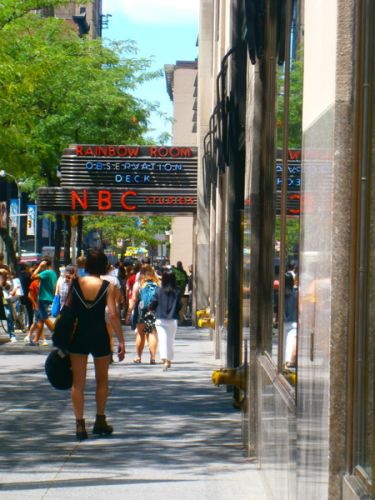 Ο δρόμος μας στη συνέχεια μας οδήγησε μπροστά από το κοσμηματοπωλείο Tiffany and Co. Δυστυχώς η Holly Golightly δεν ήταν εκεί… Σειρά είχε ο πύργος του Donald Trump με τον εσωτερικό χώρο που μοιάζει με κρεμαστό κήπο της Βαβυλώνας που ατυχώς μόλις άγγιξε ο Μίδας. Πιο κάτω, στην 49th και 6th Avenue, περάσαμε από τα στούντιο του NBC και μετά φτάσαμε στο Rockefeller Center, εκεί που τοποθετείται το κεντρικό χριστουγεννιάτικο δέντρο της πόλης και το παγοδρόμιο. Τώρα στη θέση του δέντρου βρίσκονταν ένα αρκουδάκι του Jeff Coons, φτιαγμένο από φυτά, που δέχονταν τις περιποιήσεις του κηπουρού. Στη γωνία ένα τεράστιο κατάστημα Lego γεμάτο παιδάκια! Η πρώτη μας βόλτα στο Μανχάταν θα ολοκληρωνόταν στην Times Square. Πολύχρωμη και φασαριόζικη, η Time Square γίνεται ένας ακόμα μεγαλύτερος καλειδοσκοπικός πονοκέφαλος, όταν πέφτει η νύχτα και ανάβουν τα φώτα της Broadway. Τεράστιες οθόνες και αφίσες, διαφήμιζαν εκτός των άλλων, τα διάφορα showτου Broadway, όπως για παράδειγμα το rock musical “Hedwig and the Angry Inch” στο οποίο μέχρι ένα μήνα πριν πρωταγωνιστούσε ο Neil Patrick Harris (o Barney από το “How I Met Your Mother”) και το μεγάλο hit της σεζόν, το “Book of Mormon”.