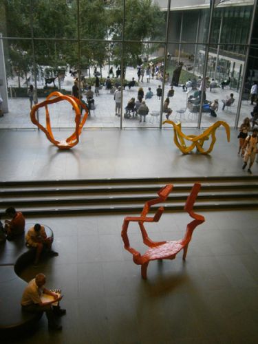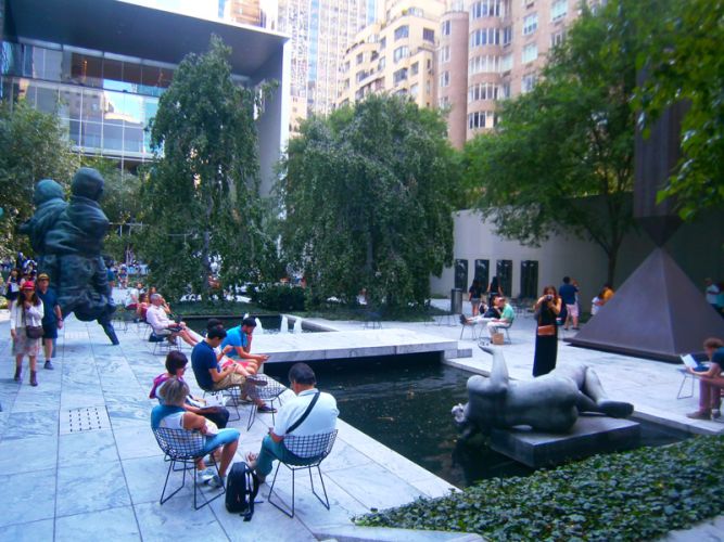 Ανοίγοντας τις πόρτες του το 1929 και με το νεότερό του κτίριο να εγκαινιάζεται το 2002, το ΜΟΜΑ, το Μουσείο Μοντέρνας Τέχνης της Νέας Υόρκης, προσέφερε ένα συναρπαστικό απόγευμα σε όλους εμάς τους επισκέπτες του. Δεν ξέρω με τι ενθουσιάστηκα πάνω από όλα. Με την τεράστια συλλογή έργων μοντέρνας τέχνης, (Van Gogh, Picasso, Dali, Mondrian, Monet, Matisse, DeChirico, Frida Kahlo, Warhol, Francis Bacon, Max Ernst, Duchamp και πάρα πολύ άλλοι); Με την τύχη μου που η παραμονή μου στην πόλη συνέπεσε με τρεις πολύ ενδιαφέρουσες προσωρινές εκθέσεις του ΜΟΜΑ ( Την έκθεση με σκίτσα και ολοκληρωμένα έργα του Toulouse – Lautrec, “The Paris of Toulouse-Lautrec: Prints and Posters”, την έκθεση “Sites of Reason: A Selection of Recent Acquisitions” με τίτλο που αποτελεί παραφθορά της φράσης της Gertrude Stein, “the sight of a reason” και την έκθεση “Conception sof Space: Recent Acquisitions in Contemporary Architecture” που περιλαμβάνει 20 projectsαπό διεθνείς αρχιτέκτονες και καλλιτέχνες, όπως για παράδειγμα οι Herzog and DeMeuron, Alvaro Siza, Kengo Kuma, που παρουσιάζονται με τη μορφή σχεδίων, μακετών, βίντεο, φωτογραφιών και εγκαταστάσεων-δωματίου); Ή με την αρχιτεκτονική του ίδιου του κτιρίου, τον τρόπο που καδράρει την πόλη μέσα από τα ανοίγματά του και την υποδειγματικά διαμορφωμένη αυλή του που σφύζει από ζωή;